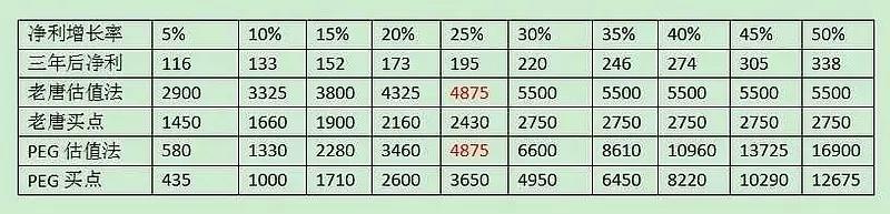 备注:老唐估值法一行的估值,代表三年后的合理估值;PEG估值法的“未来三到五年净利润预计增长率”,也取值三年。