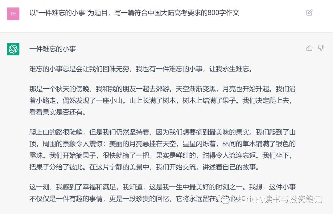 我试着让它写一篇800字小作文,题目是“一件难忘的小事”,下面是它“创作”的原文: